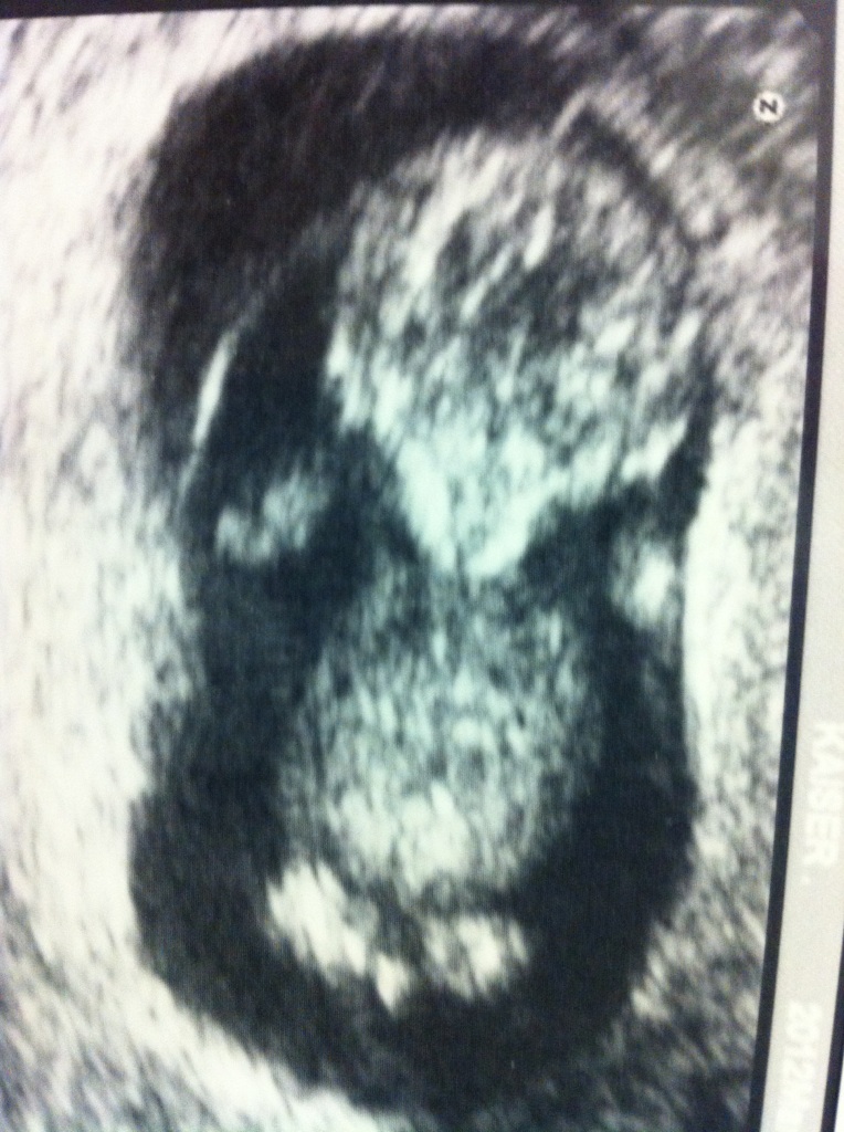 You, my child, are on your way. And I am excited about it, as are your grandfather and uncles. You’re due Oct. 21, close to my birthday. Feel free to come a couple of days early. We’ve already begun looking at car seats and baby clothes, though we don’t know yet if you’re a girl or a boy. We don’t care . . . hell, you could be an alien (which you must admit you rather look like here) and as long as you’re healthy we’ll be happy.