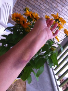 Two full, nine-hour days of work and not one person noticed my fabulous battle wound. It’s fading now, so it’s less likely to be noticed and certainly won’t be as much fun. Bother. What good is having a 3X2-inch green, yellow, black, red and purple bruise if there’s no one around to appreciate it? I mean, I’ve been choosing my wardrobe to match whatever color is dominant one day to the next and everything.