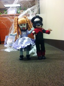 It’s 8:13 p.m. on Oct. 13, no matter what day the blog says it is. I’m sitting in my office surrounded by cobwebs, family photos and creepy dolls. Not scary enough. I figured I’d come decorate a bit while I was waiting for the boys to get out of the college play DS was required to attend at the King Center.