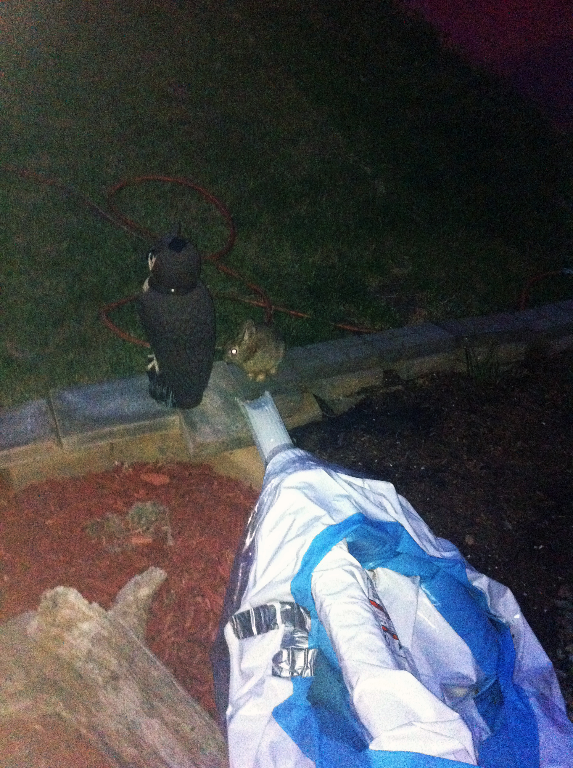 Until today. No corpse thankfully, but there was Peter, sitting proudly, ears erect in the middle of my back yard. I giggled. I was certain Mina couldn’t catch him, so I threw the sliding glass door open and said, “GET ‘EM!” thinking it might teach the chap a lesson.