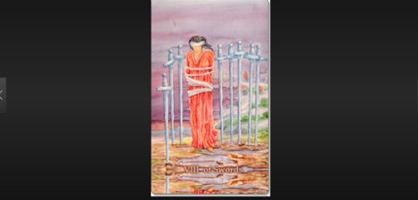 “The Eight of Swords has appeared today to urge you to take some time to stop thinking or at least slow your thought process. The swords surrounding the woman represent the thoughts that are keeping her trapped and blinded to the truth of her circumstances. If you feel like your mind is racing and you can’t slow down, take ten to fifteen minutes today to sit with your eyes closed and focus on just one thing. Whether it is your breathing or the sound of a fan in the room, focusing on something that is happening in the present moment will help you get out of your head so you can see things a little more clearly.”