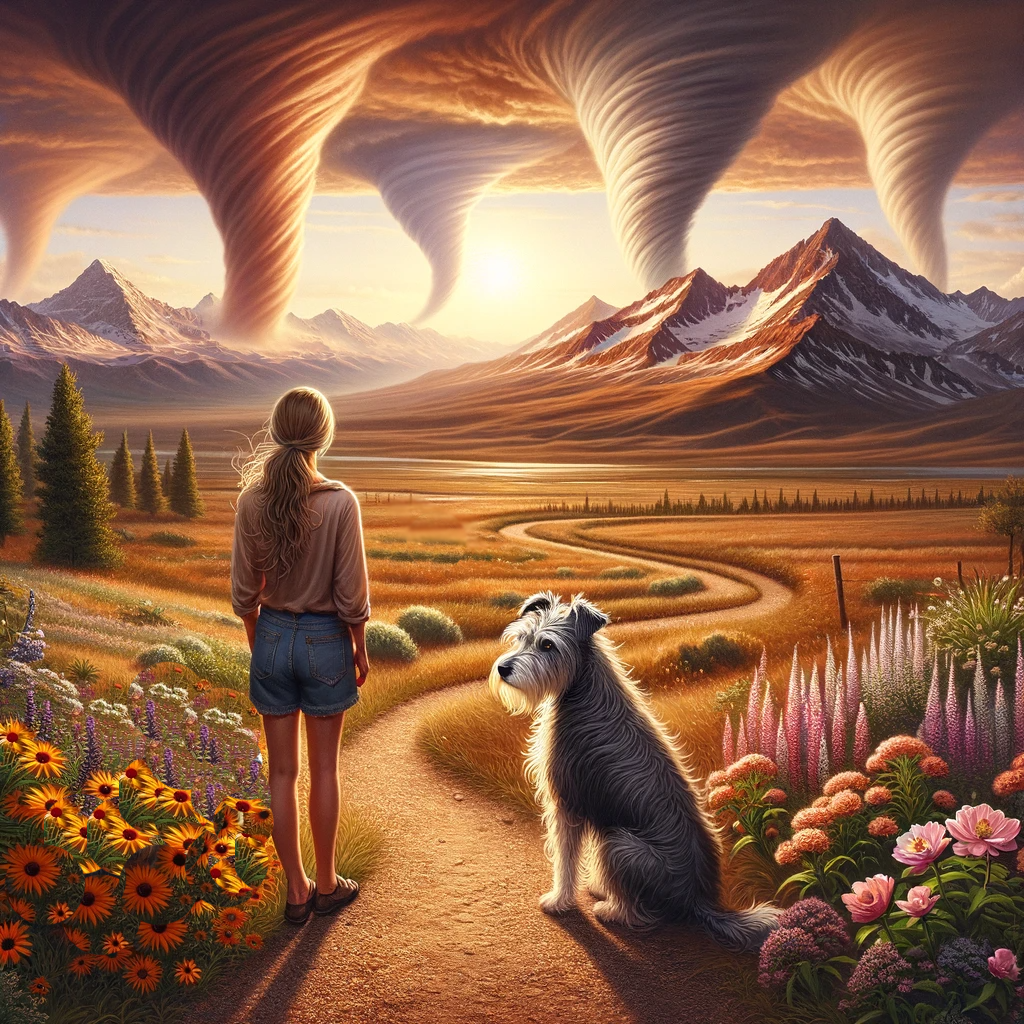 When I finally found my way through — navigating the tunnels of what seemed like an endless underground skatepark — Max and I ran up the northeasterly stairs to find ourselves in a field. The exit still visible behind and below us, we were in a plain of high-desert wildflowers that led to a forest. To the west, north and east there were in each direction three tornadoes of radiant colors of peach, pink and gray, spiraling, yes, but in a peaceful, welcoming and non-violent way.